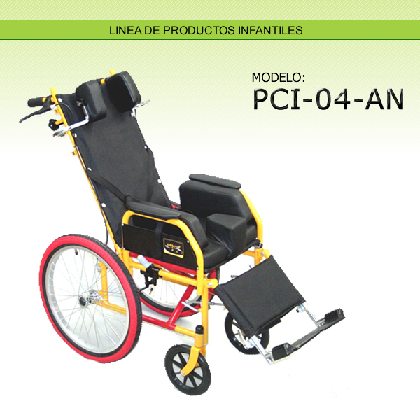 Silla de ruedas para niños con parálisis cerebral (PCI), plegable y reclinable, esmaltada con pintura electrostática, elevapiernas con talonera de vinil acojinado, descansapiés de aluminio, asiento acojinado con vestidura de polivinil y bloque abductor de poliuretano, respaldo acojinado con vestiduras de polivinil y soporte de lona sintética, cojines laterales, soporte cefálico acojinado con seis alturas ajustables, cinturones postulares de tronco, ruedas traseras de 20” con rines de acero y llantas neumáticas, ruedas delanteras de 8” con rines de polipropileno y llantas sólidas.